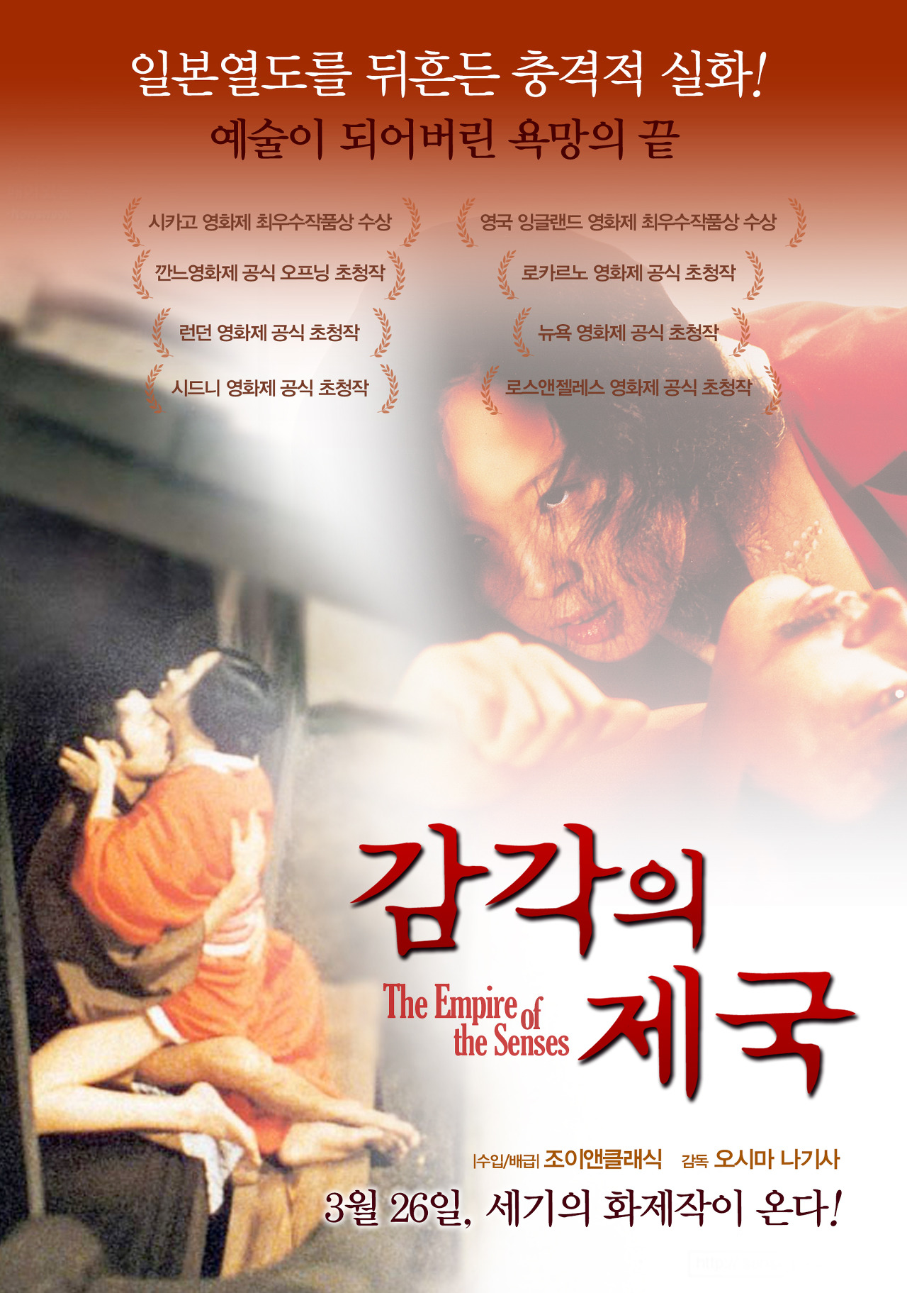 당연히 청소년 관람 불가다! 2019년 7월 11일 CGV아트하우스에서 개봉했다. 헐!~ 이번 무삭제 대개봉은 포털에 체크조차 되지 않는다. 대한민국에는 수십 년 전 영화가 2000년, 2015년 개봉했다. 일본 영화이자 프랑스 영화기도 하다. 당연히 가당치 않게 해당 제목을 딴 영화들도 몇 편 개봉한 영화! 정말 영화 마니아라면 보라고 추천한다. 물론 정말로 무삭제 판이라면 현재 시점에서도 적지 않은 충격을 받을 수 있으니 심장 약하신 분들에게는 권하고 싶지 않다. 1976년 작이다.